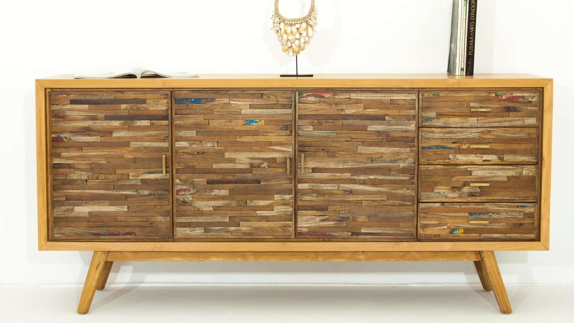 Sobriété et élégance : grâce ses petites poignées discrètes en laiton qui se fondent parfaitement avec la teinte du teck recyclé. Monté sur des pieds compas qui donnent à ce grand bahut en teck massif une sensation de légèreté.