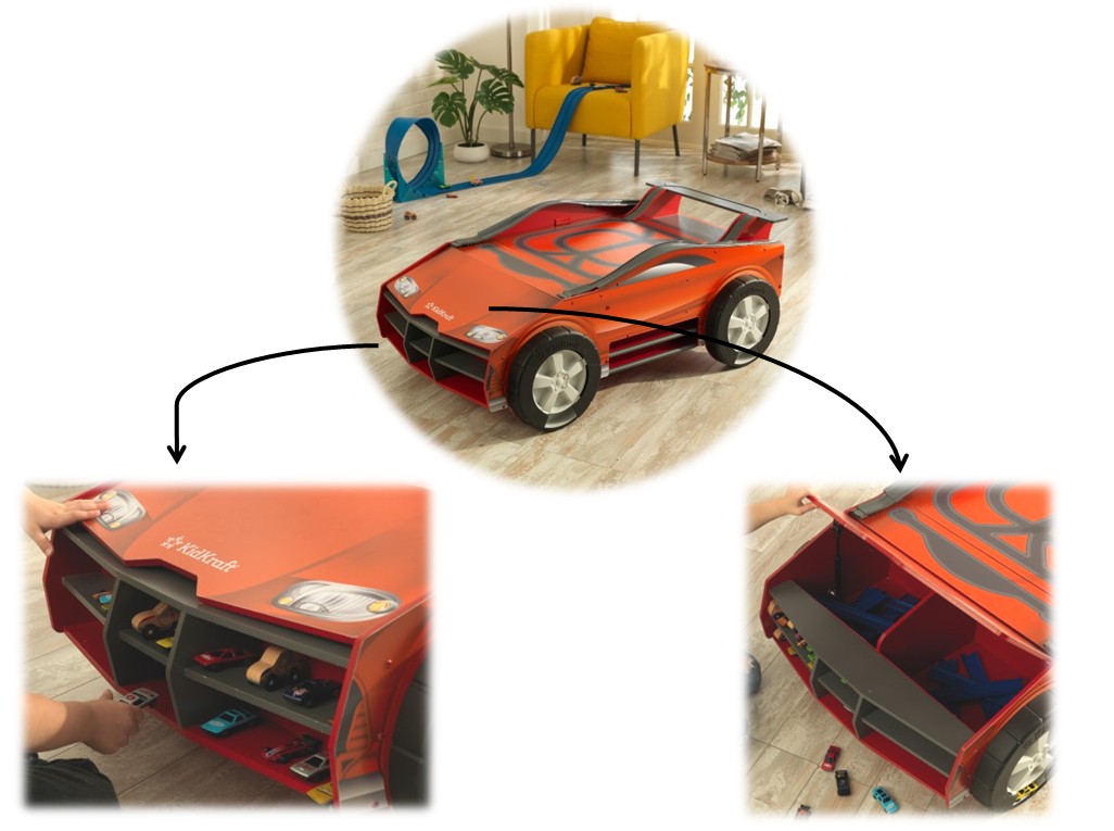 2 grands rangements sous le capot Après avoir baissé l'aileron, votre enfant découvrira de grands rangements sous la carrosserie. Avec des rayonnages sur la calandre, sur les côtés et sur le pare-chocs pour pouvoir garer jusqu'à 56 voitures |